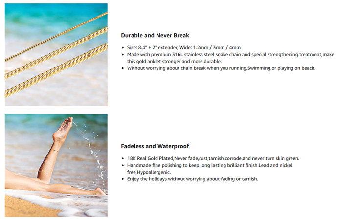 - Suitable for Any-Occasioan: Come with a delicate gift box. Perfect as a gift for her. This gold anklet bracelets for women is waterproof, fadeless, resists sweat & seawater. You can always wear it when swimming, bathing, sporting, or playing on beach, don't worry about tarnish or broken. Very nice for daily wear, ball, party, anniversary, prom, graduation, birthday or any special occasions. It will make you stand out in the crowd. Also as a perfect gift for her.