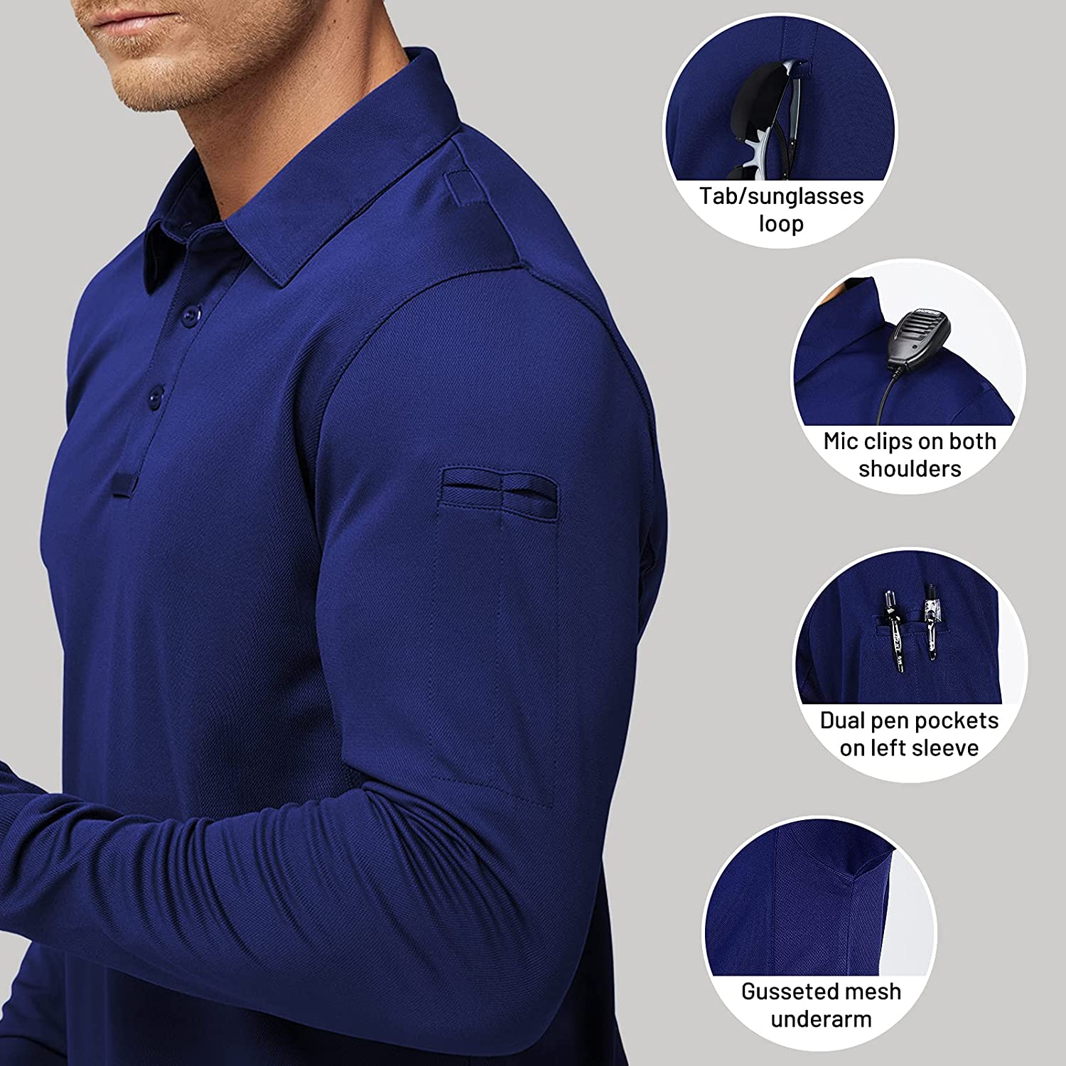 • No-roll collar gives this polo shirt a professional look with all the tactical functionality to get the job done. 3-button placket front with mic tab/sunglasses loop. Mic clips on both shoulders