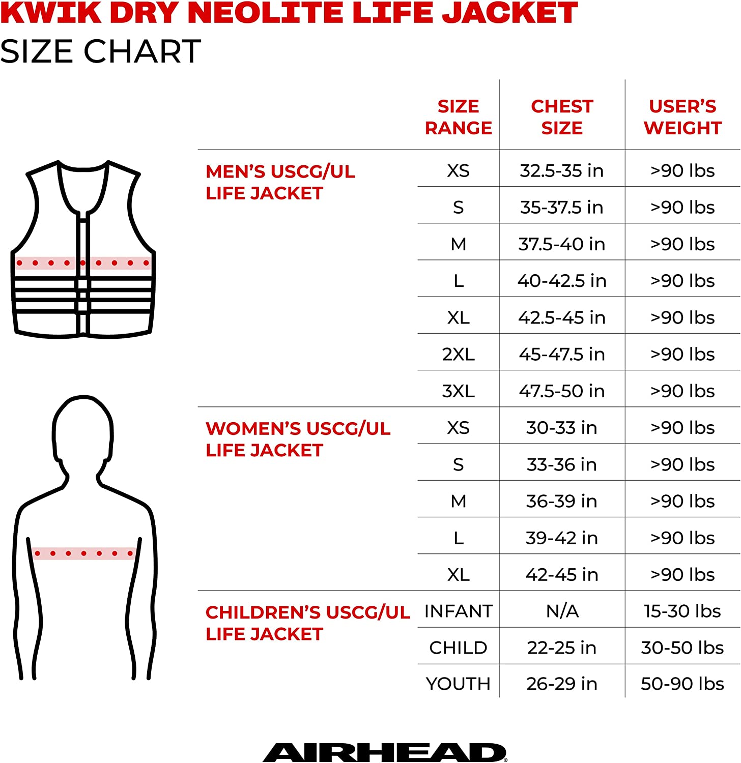 The U.S. Coast Guard approved, Wicked Neolite Kwik-Dry Life Jacket meets requirements to keep you safe across boating, floating, tubing, and riding. Kids and adults alike adore the bright colors and Kwik-Dry Neolite material, which wraps you in warmth when the wind picks up. With Wicked, you get the best of both worlds—a durable zippered closure and double quick-release buckles, making this life jacket secure and easy to remove. In the infant style, the extra flotation element at the head of the jacket offers maximum safety for your youngest during water adventures. The Wicked Neolite life jacket’s pattern design is guaranteed to turn heads with its multi-dimensional shades of vibrant pink, black, and white. Get this life jacket in the full range of sizes, from infant to adult XL. What size should I wear? Disclaimer: Please use the size chart: Neolite life jackets may feel snug or run a little small. If you are unsure or in between sizes, we would recommend choosing the larger size.