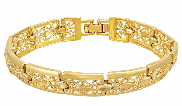 ? This 9mm ( ~ 3/8 inch ) Filigree Bracelet for women is MADE TO LAST with up to 20X more 24 karat gold plating than other electroplated fashion jewelry; This elegant bracelet makes a statement with its intricate and delicate design; Choice of yellow or white gold (rhodium)