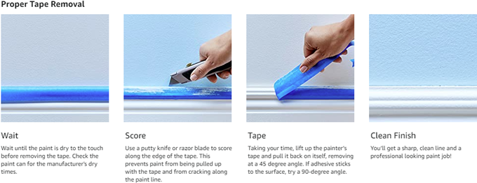 • HOW TO USE: Let the firmly applied tape set for 30 to 60 minutes before starting to paint, and when paint is dry to the touch, lift tape up slowly to remove at a 45-degree angle