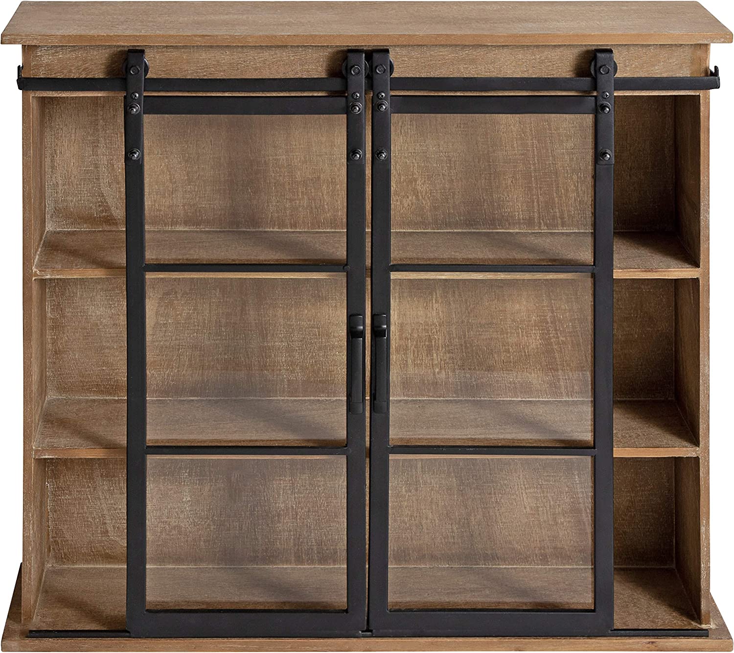 MODERN FARMHOUSE DESIGN: This wall hanging cabinet features a hand-distressed wooden finish and two beautiful metal framed sliding glass doors for the ultimate modern farmhouse accent
