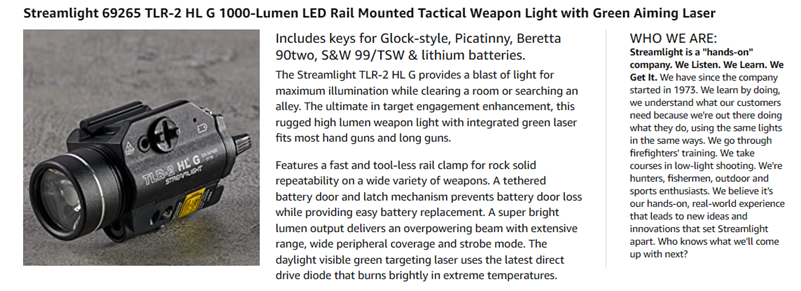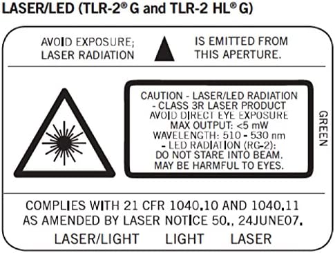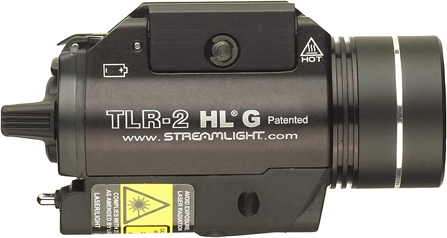The TLR 2 HL G with green laser provides an 1000 lumen blast of light for maximum illumination while clearing a room or searching an alley. Its wide beam pattern lights up large areas so you can identify who or what is nearby. LED technology, impervious to shock with a 50,000 hour lifetime; 510 530nm direct drive green laser with wide operating temperature range. 800 lumens; 15,000 candela peak beam intensity; 245m beam; runs 1.5 hours (Laser/LED simultaneously); Laser only function runs 17 hours. Engineered optic produces a concentrated beam with optimum peripheral illumination. Green laser provides high visibility long range targeting. Powered by two 3 Volt CR123 lithium batteries with 10 year storage life. Rail grip clamp system securely attaches/detaches quickly and safely with no tools and without putting your hands in front of muzzle. Mounts directly to handguns with Glock style rails and to all MIL STD 1913 (Picatinny) rails. Includes keys for Glock style, Picatinny, Beretta 90two, S&W 99 and S&W TSW. Machined aluminum sealed construction with black anodized finish. Ambidextrous momentary/steady on/off switch. User programmable strobe can be enabled/disabled. Operating temperature: 40 to +120 Degree Fahrenheit. IPX4 water resistant. Remote switches are available as optional accessories and must be used in conjunction with 69130 or 69161 remote door switch. All switches and door switch are sold separately. Limited lifetime warranty. Assembled in USA.