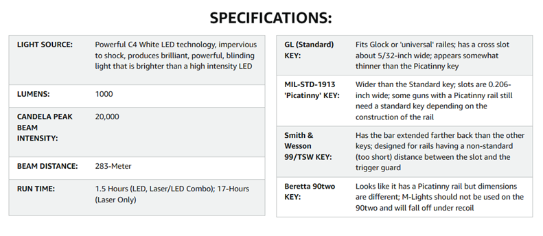 | Included Components | Tactical Laser/Light Unit, Mounting keys |