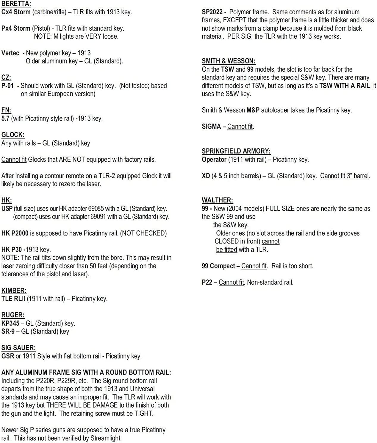 SIG SAUER: GSR or 1911 Style with flat bottom rail - Picatinny key. ANY ALUMINUM FRAME SIG WITH A ROUND BOTTOM RAIL: Including the P220R, P229R, etc. The Sig round bottom rail departs from the true shape of both the 1913 and Universal standards and may cause an improper fit. The TLR will work with the 1913 key but THERE WILL BE DAMAGE to the finish of both the gun and the light. The retaining fastener must be TIGHT. Newer Sig P series guns are supposed to have a true Picatinny rail. This has not been verified by Streamlight. SP2022 - Polymer frame. Same comments as for aluminum frames, EXCEPT that the polymer frame is a little thicker and does not show marks from a clamp because it is molded from black material. PER SIG, the TLR with the 1913 key works.