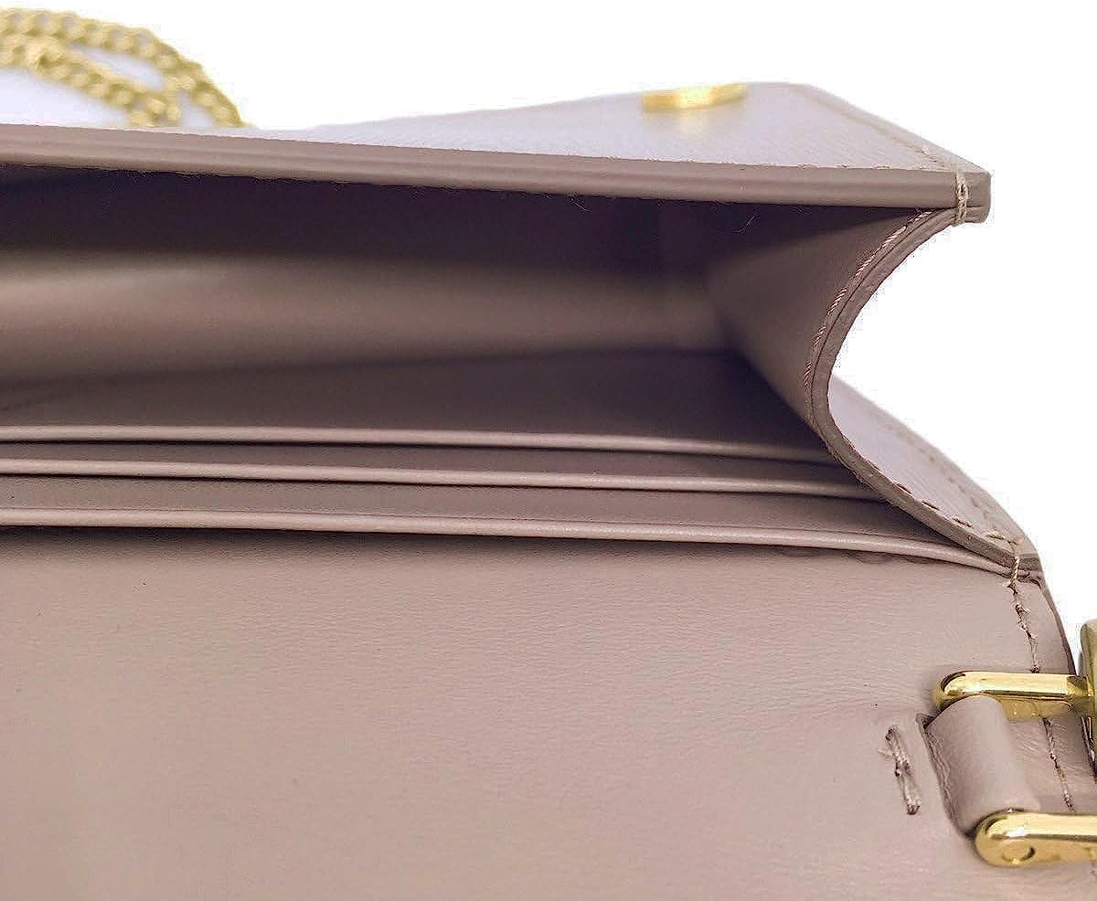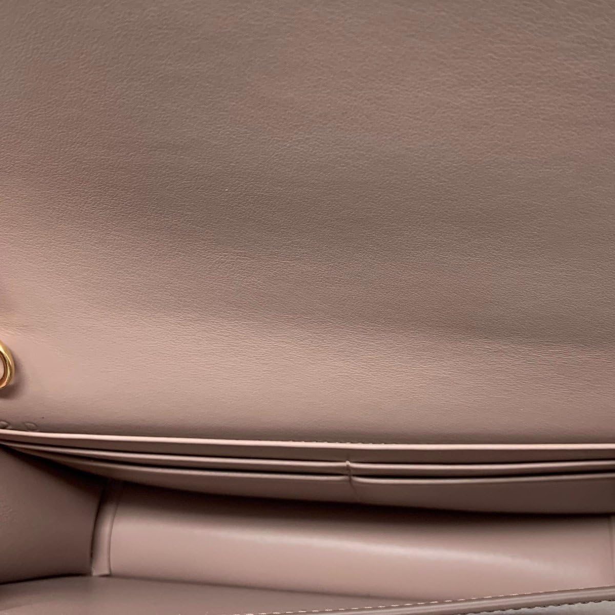 • Color is Cipria Beige. Leather. Miniborse Vitello Move I Crossbody/ Chain wallet. Gold-Tone Hardware. Detachable Strap