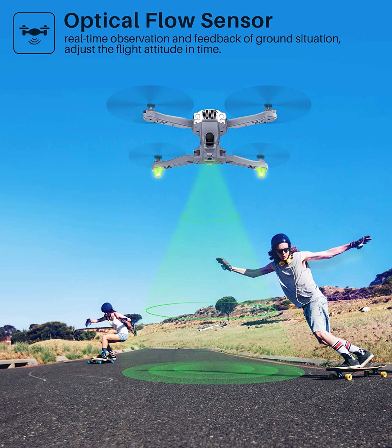 Photo&Record Button with Hand Gestures--The control range of 2.4GHz transmitter reaches to 10000 feet high range.Easy to control the aircraft to record and photo by your hand gestures under the 300inch distance.Intelligent optical flow positioning system support real-time observe the ground situation. No worries during flying.