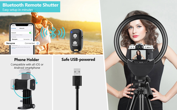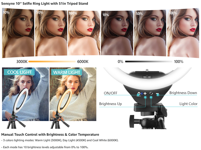 - 【High Brightness & Clever Touch Control】Sensyne selfie ring light features a high sensitivity touch panel design that has a longer life than traditional mechanical buttons. It provides full control to easily adjust the 3 color modes (cool white, warm yellow and daylight) and 10 brightness levels to meet your different needs. Perfect for Photographers, YouTubers, Vloggers, TikTokers, etc.