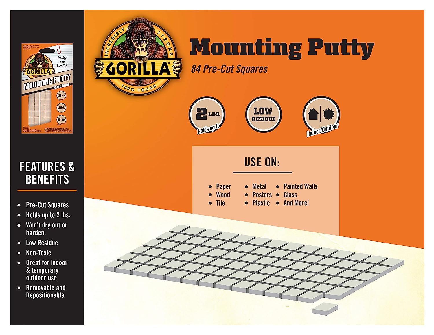 Gorilla Mounting Putty is ideal for hanging light weight items in place of traditional tapes, push pins, and fasteners. Squares are non-toxic, repositionable, and long lasting. Great for use indoors and temporary outdoor use. Use on paper, painted walls, wood, tile, metal, posters, plastic, glass, and more!
