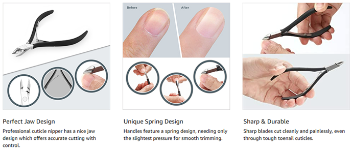 SUPER SHARP: Hand filed high performance blades of Cuticle Nippers offer clean & precise cut of nail cuticles every time without pulling or tugging. Use the bonus cuticle pushers to push cuticles before cutting.