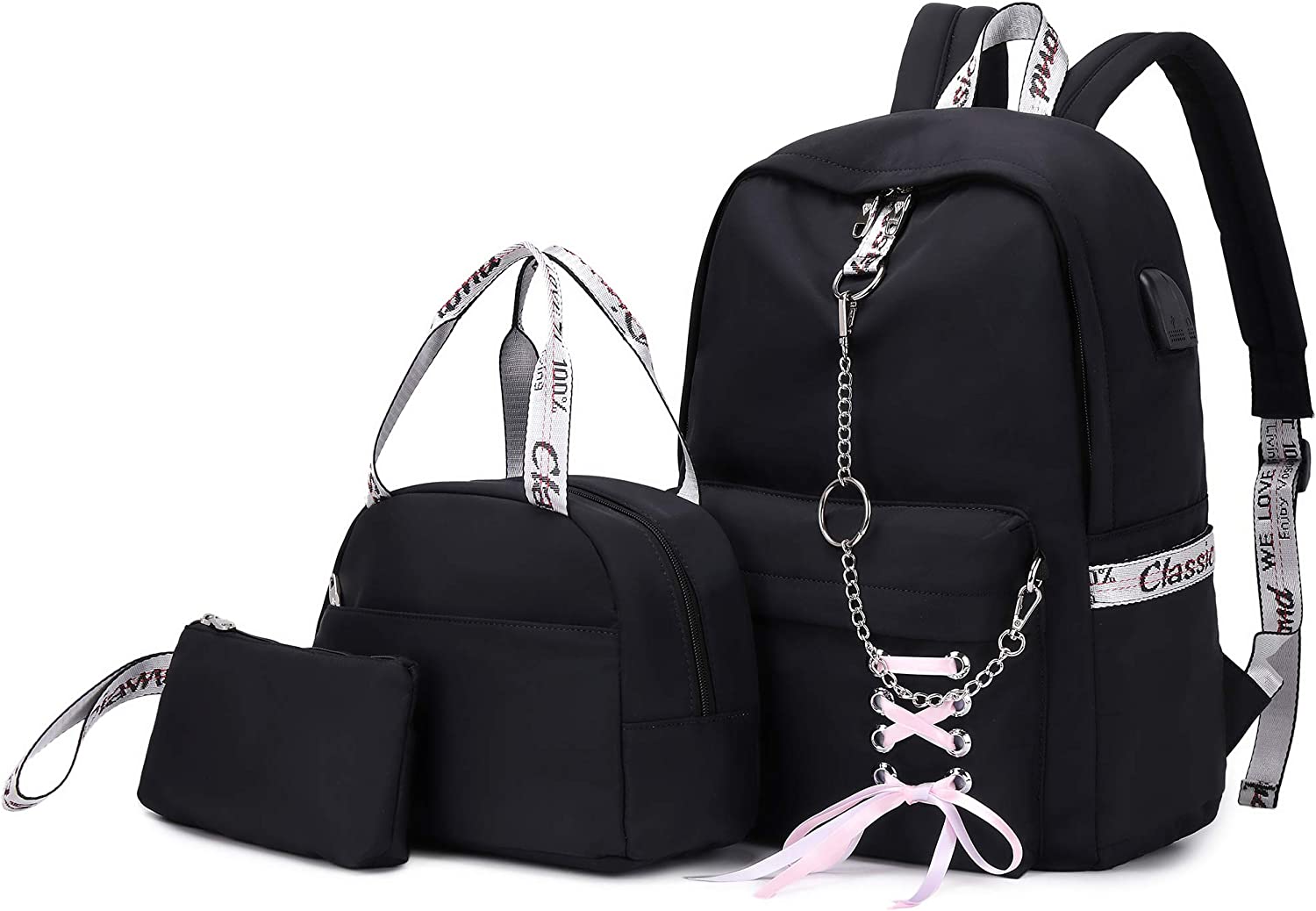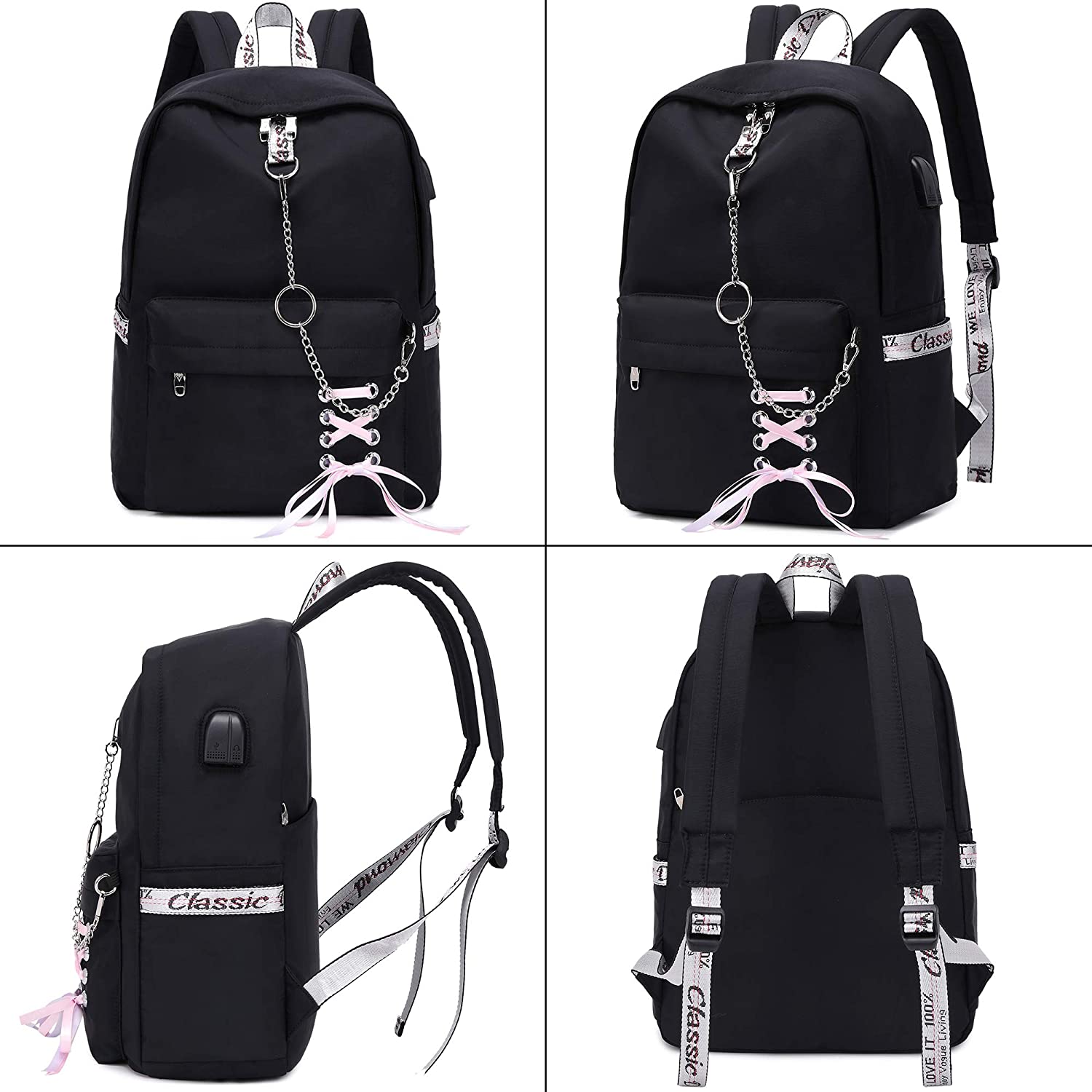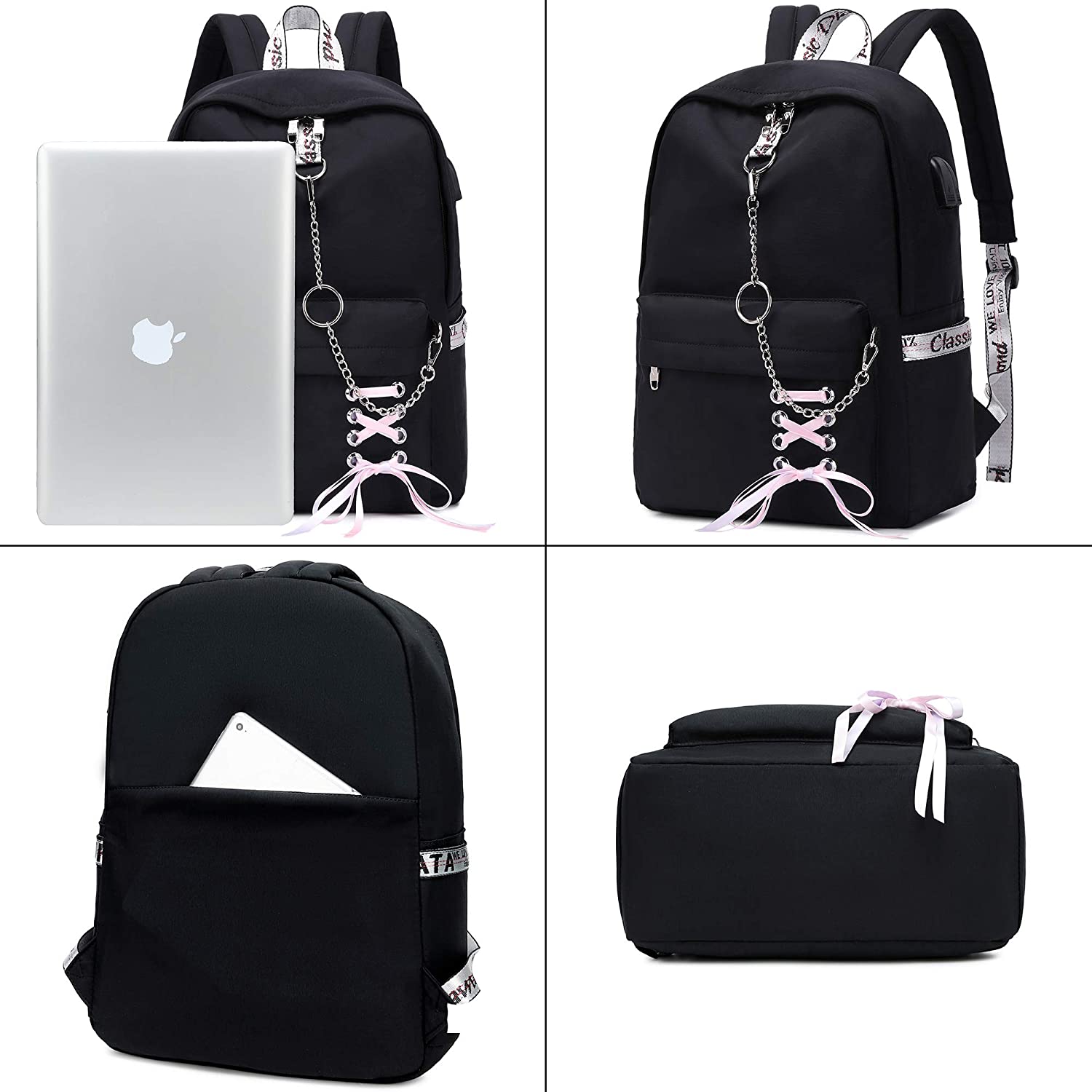 SCHOOL BAG with BUTTERFLY KNOT and CHAIN: The butterfly knot made of ribbon is our original design, which makes backpack look charming and beautiful when it is embellished on this pure black/pink/grey school bag. Chain design is fabulous, its decoration matching bow knot makes the backpack look more elegant and fashionable. You can graffiti your favorite pattern into the blank solid color space of backpack, which makes it more special.