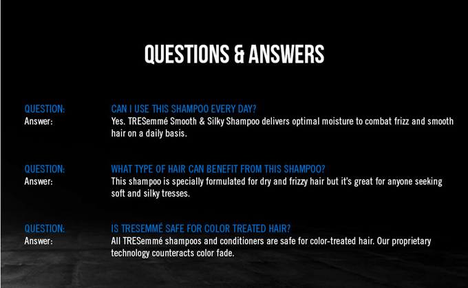 Want to restore moisture lost from heat styling? Try TRESemmé Smooth and Silky to quench dry hair and tame unruly hair. TRESemmé wants you to look and feel your best, which is why the TRESemmé Smooth and Silky System delivers optimized hydration that targets dryness and locks in moisture where your hair needs it most—every day. Enriched with Moroccan Argan oil, this gentle shampoo is designed to deliver optimum hydration that targets dryness and seals in moisture. The lightweight formula means you can turn dry, damaged hair into soft, manageable strands with beautiful shine. It’s also safe for colored hair. How to use the Smooth and Silky System: Step 1: Coat hair with a liberal amount of TRESemmé Smooth and Silky Shampoo. Step 2: Gently massage the scalp and roots with fingertips to work into a lather. Step 3: Lightly squeeze the shampoo from roots to ends and rinse thoroughly. Step 4: Apply an adequate amount of Smooth and Silky Conditioner from mid-shaft to ends. Step 5: Run a wide-tooth comb or fingers from roots to ends to detangle and fully coat hair. Leave for 2-3 minutes, then rinse thoroughly. Step 6: Finish with your favorite TRESemmé styling products as desired. Are you looking for a moisturizing shampoo for damaged hair? The clear choice is TRESemmé. Use TRESemmé Shampoo with TRESemmé's salon-quality hair styling products to perfect your look. These professional, salon-quality hair care products are deep conditioning hair products for dry hair without the salon price tag. TRESemmé Smooth and Silky Shampoo and Conditioner system delivers intense hydration that calms frizz and tames pesky flyaways, all while yielding up to 7x smoother hair, vs. non-conditioning shampoo. Ever since our origin in salons, TRESemmé has been driven by a simple truth: every woman deserves to look and feel their best, and that usually starts with a good hair day.