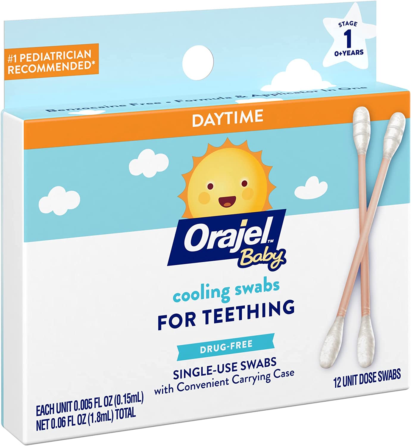 Orajel Baby Daytime Cooling Swabs for Teething, Drug-Free, 1 Pediatrician Recommended Brand for Teething*, 12 Swabs in Carrying Case(Packing May Vary)