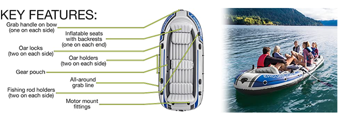 | Included Components | Intex Excursion 5, All-Around Grab Line, 5-Person Inflatable Boat Set With Aluminum Oars And High Output Air Pump, U.S. Coast Guard I.D, Repair Patch, Gear Pouch, Storage Duffel Bag |