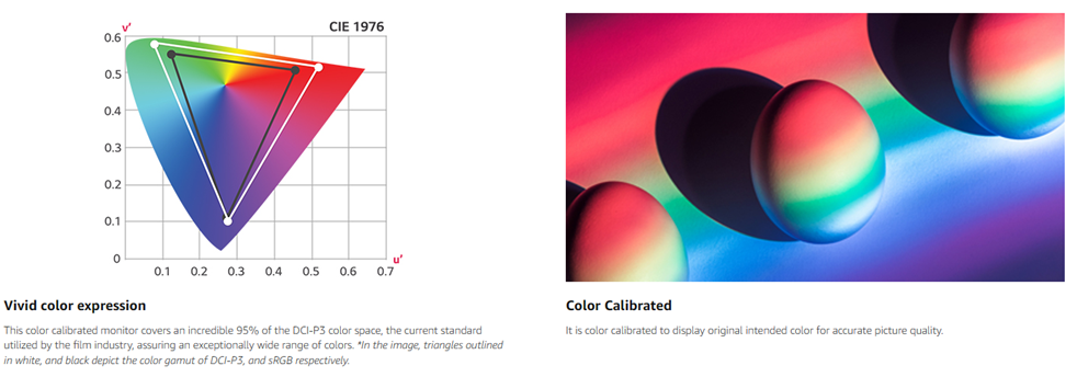 The UHD 4K IPS monitor that does it all. Elevate your views with the UHD monitor ranked #1 in the U.S. At 31.5" and 16:9 screen ratio, LG's UltraFine Monitor with UHD 4K IPS Display features realistic, accurate color, enhanced contrast, clarity and detail at wide angles. It shines as a productivity powerhouse, delivering a flexible workstation experience and easy setup, yet amplifies gaming with cutting-edge features and elevates entertainment with HDR10 and MAXXAUDIO stereo speakers. Color Gamut (Typ.) DCI-P3 95 per cent and Color Depth(Number of Colors) 1.07B.