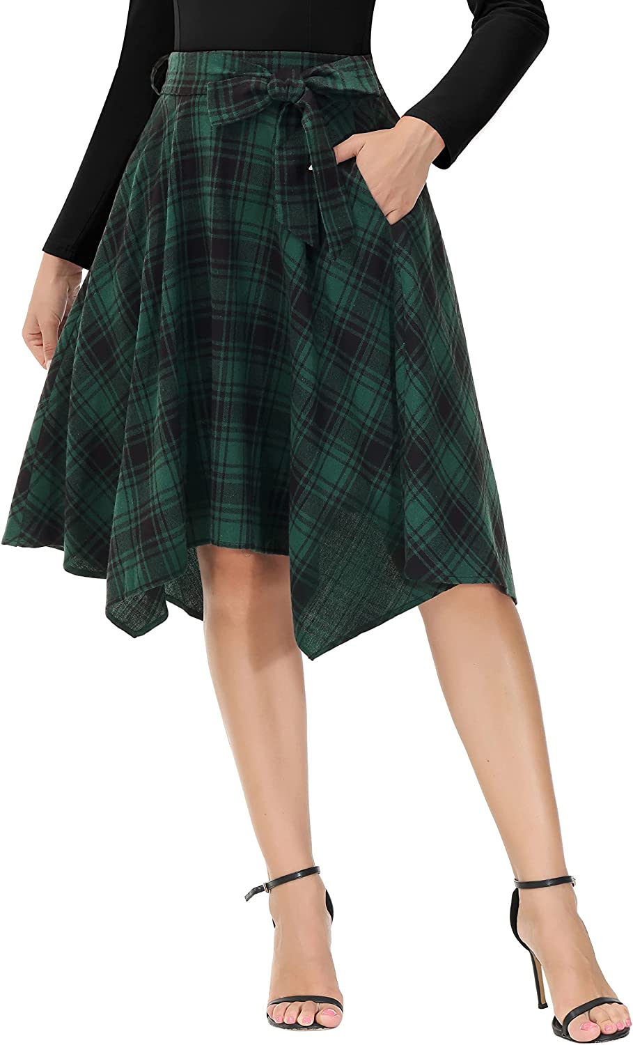 Belle Poque Women's Plaid Skirt A-Line Flared High Waisted Skirt with Pockets