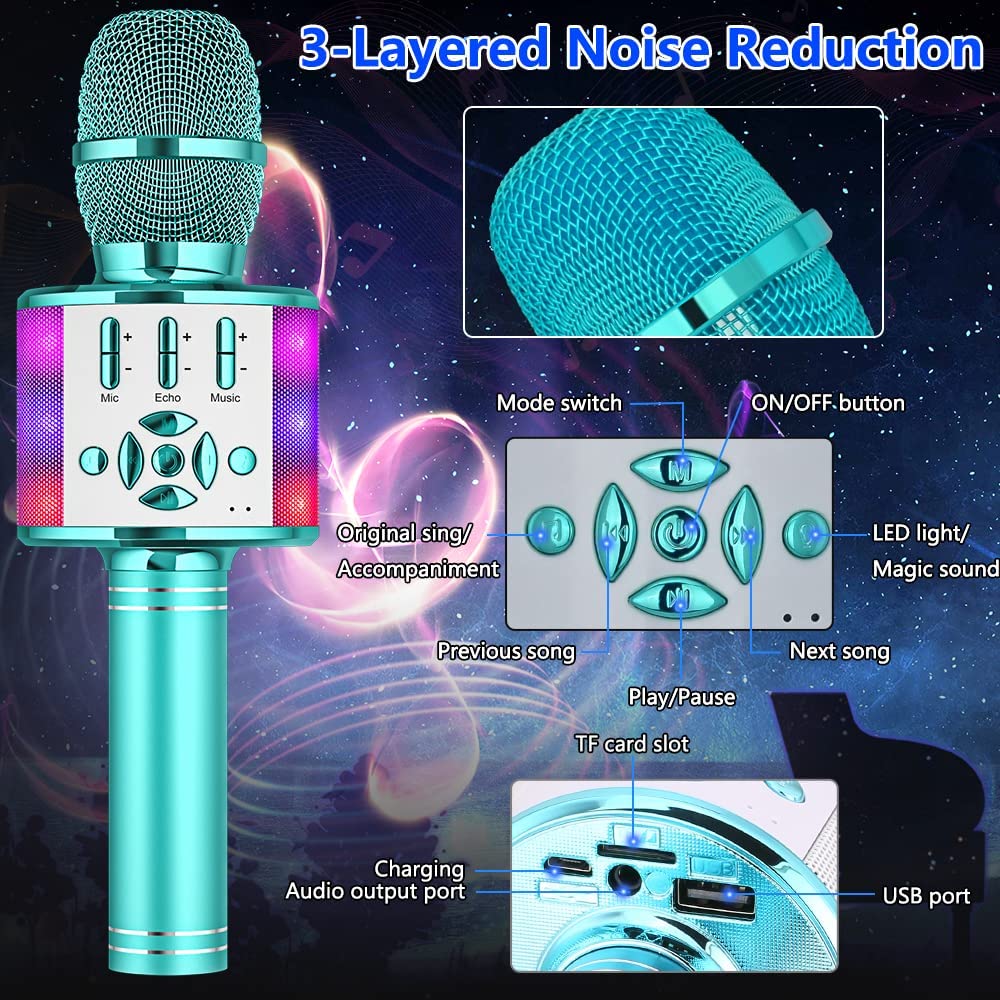 【Magic Sound + Multi-Colored LED Lights】Advanced 3-layers noise reduction technology will ensure high-quality, crystal-clear sound. Stunning KTV live-sound, and clear music rhythm with echo reverberation. With 4 magic sound modes to change your voice. And circled Multi-Colored LED Lights, LED Lights will dancing with your voice or music, makes party more happy.