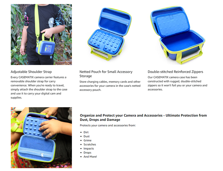 Comfortable Handle & Strap: Keep your camera safe! Our compact CASEMATIX camera case measures only 7" x 5" x 2.75" so it can be stored in toy boxes, backpacks, etc. plus it features a handle and adjustable strap!