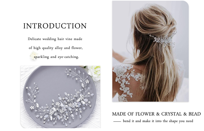 - Silver rhinestone wedding hair ornaments in unique design and excellent workmanship, made of crystal & flower & alloy wire. Party hair vine approx size: 9.84inches(25CM); 2 bobby pins and 1 ribbon for free. Silver, Gold and Rose Gold color for choose.