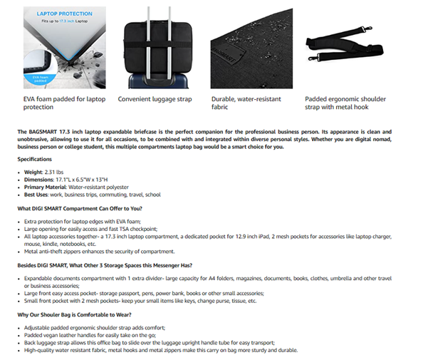 - LAPTOP PROTECTION- The dedicated laptop compartment is fully padded with EVA foam. The laptop bag can offer the optimal protection for your laptop. You don't need to worry about your notebook getting crashed on the travelling.