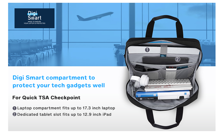 - TSA FRIENDLY & ANTITHEFT- Convenient at checkpoint. A separate tech compartment with large opening design can make you quickly pass at airport security, also keeping your laptop, 12.9'' iPad and other tech gadgets tidy. Its metal anti-theft zippers will enhance the security of the computer bag.