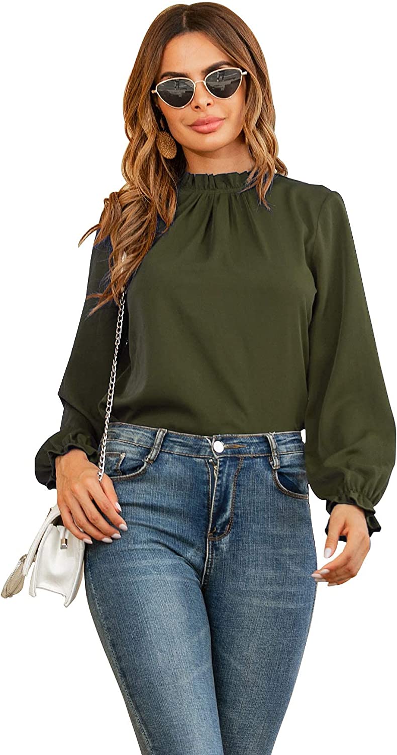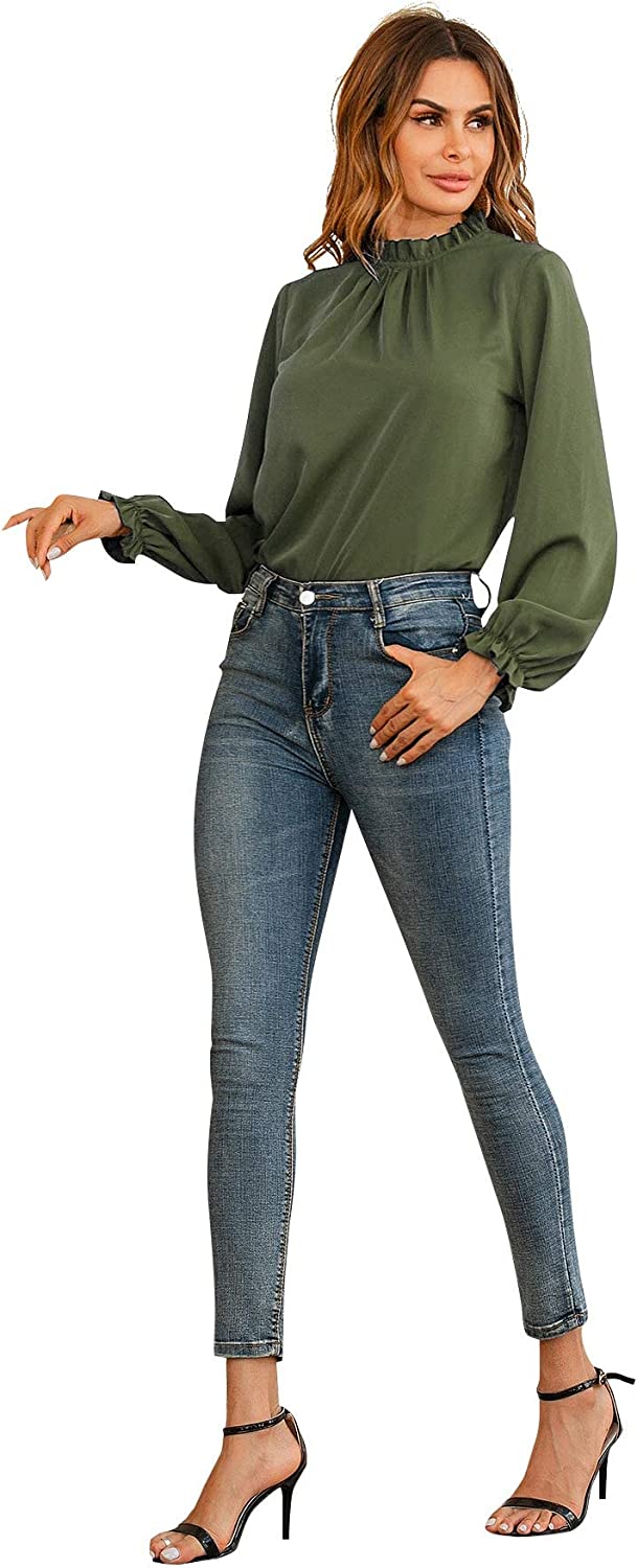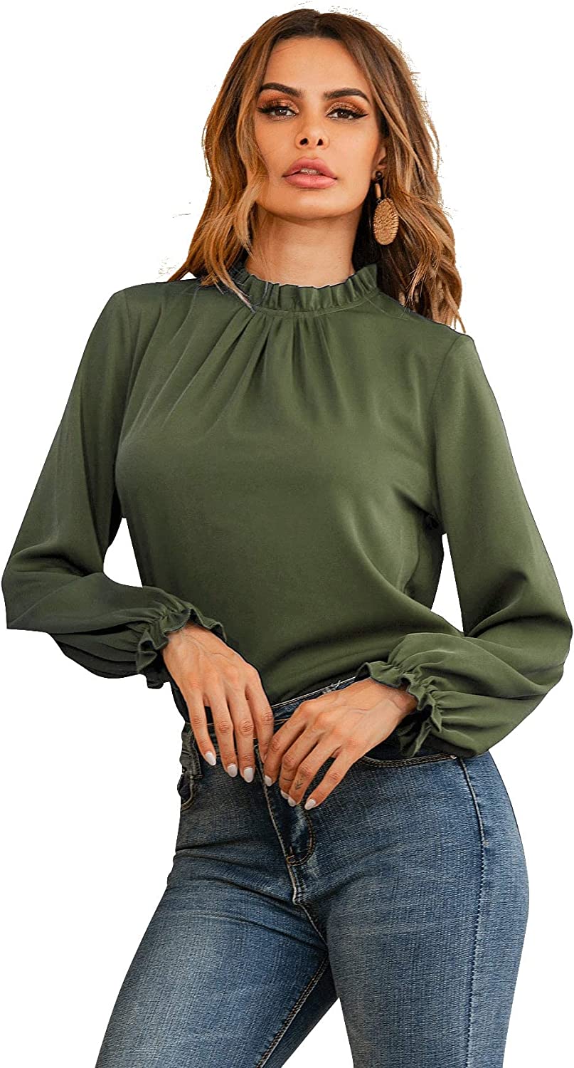 - Mock neck flounce sleeve blouse top for spring and winter. The top is not only suitable for your casual daily wear but also perfect as a wear to work/office/business wear.