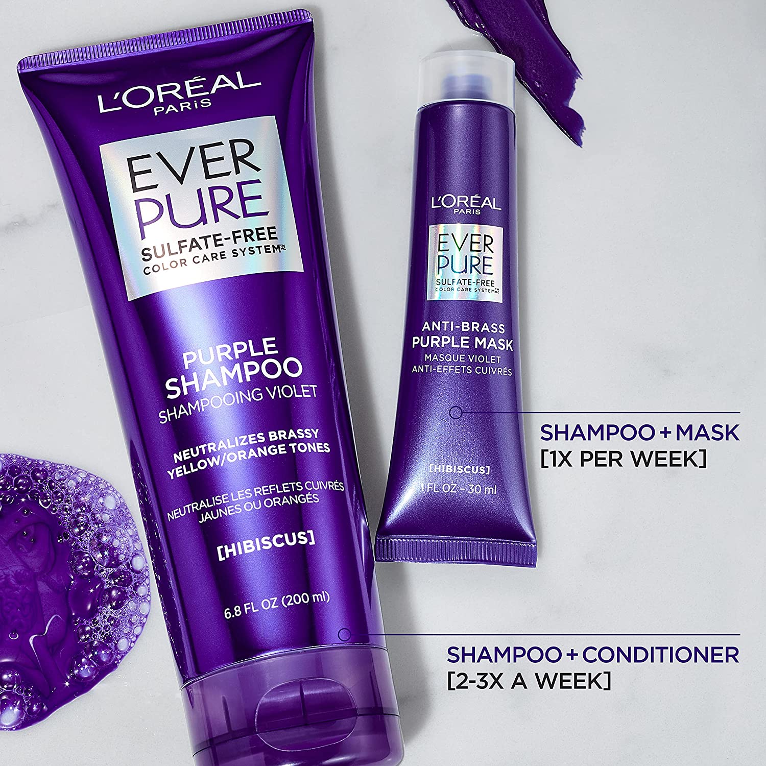 Say no to brassy hair! Your beautiful blonde colored, bleached or highlighted hair can turn brassy over time. Take charge at the First Sign of brass! Our ever Pure sulfate free ultra-pigmented anti-brass purple hair mask with hibiscus neutralizes stubborn brass and deeply nourishes hair for the ultimate blonde reset in just 5 minutes. Formulated with even more toning pigments than our purple shampoo. Best for blonde colored, bleached and highlighted hair. Blonde color-treated hair requires special care. Our formula is 100% Sulfate Free and suitable for color treated hair. Experience a creamy texture, easy application, and results in just 5 minutes! Our sulfate free formula is also paraben free and formulated with vegan ingredients. Pair with our ever Pure purple shampoo. No animal derived ingredients or by-products.