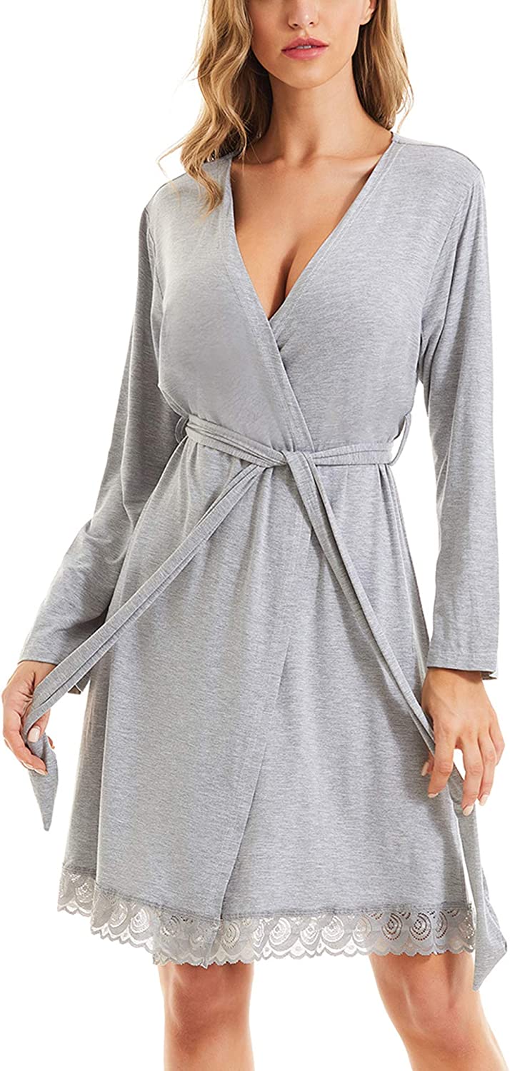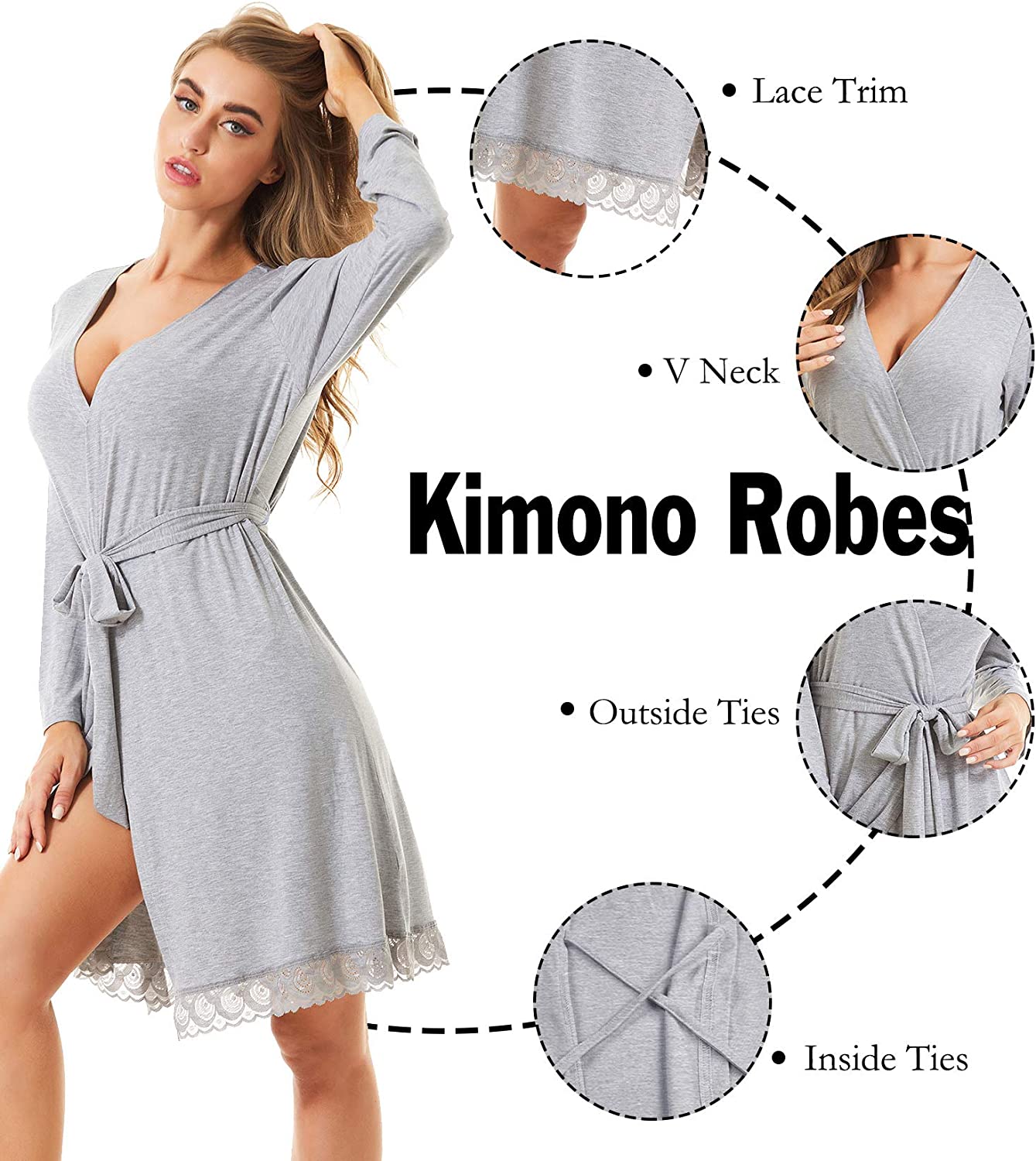 • ❀Novel Design: Womens bathrobe featuring a variety of popular elements -- long sleeve, solid color, belt, lace hem, v neckline design, inside ties. Inside ties keeps it from slipping open in addition to the outside belt. Lace hem and v neckline makes you more elegant and attractive. Perfect knee length sleep robes is convenient for women night sleepwear.