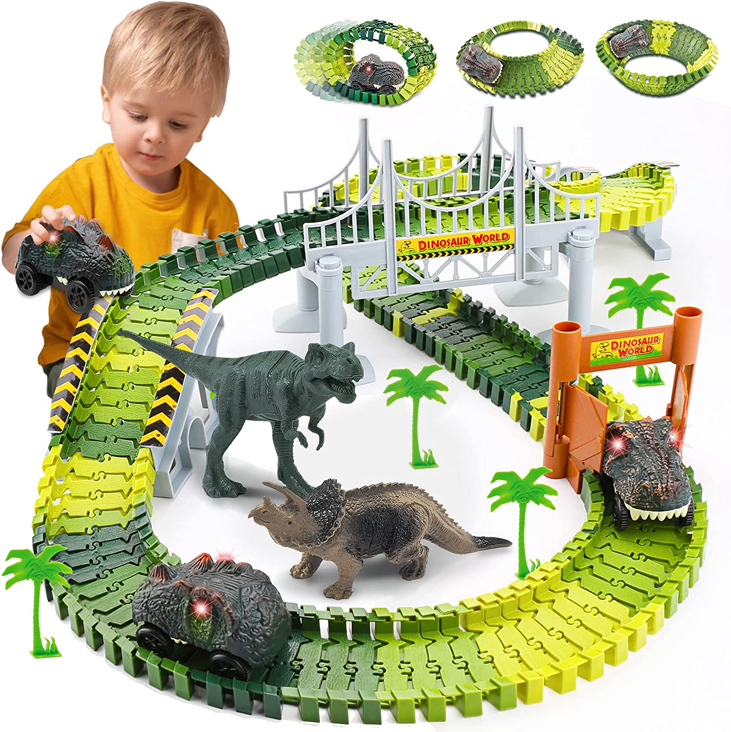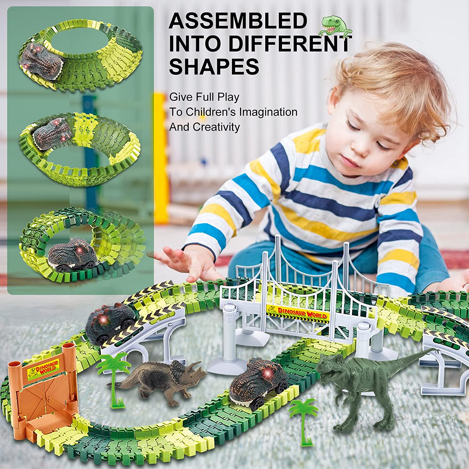 Easy to Assemble: The dinosaur tracks came in sections and race tracks for boys is very easy to snap together and alter, the individual track pieces are dynamic and flexible, which can be assembled to different shapes, great idea for 3 year old boy birthday gift