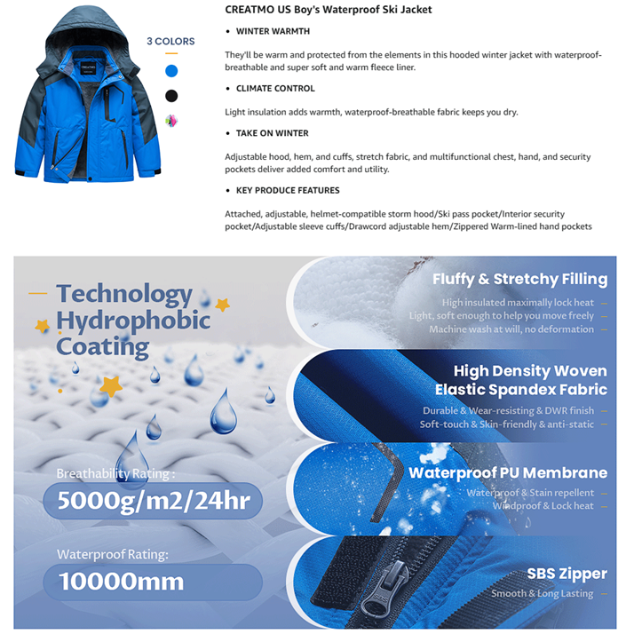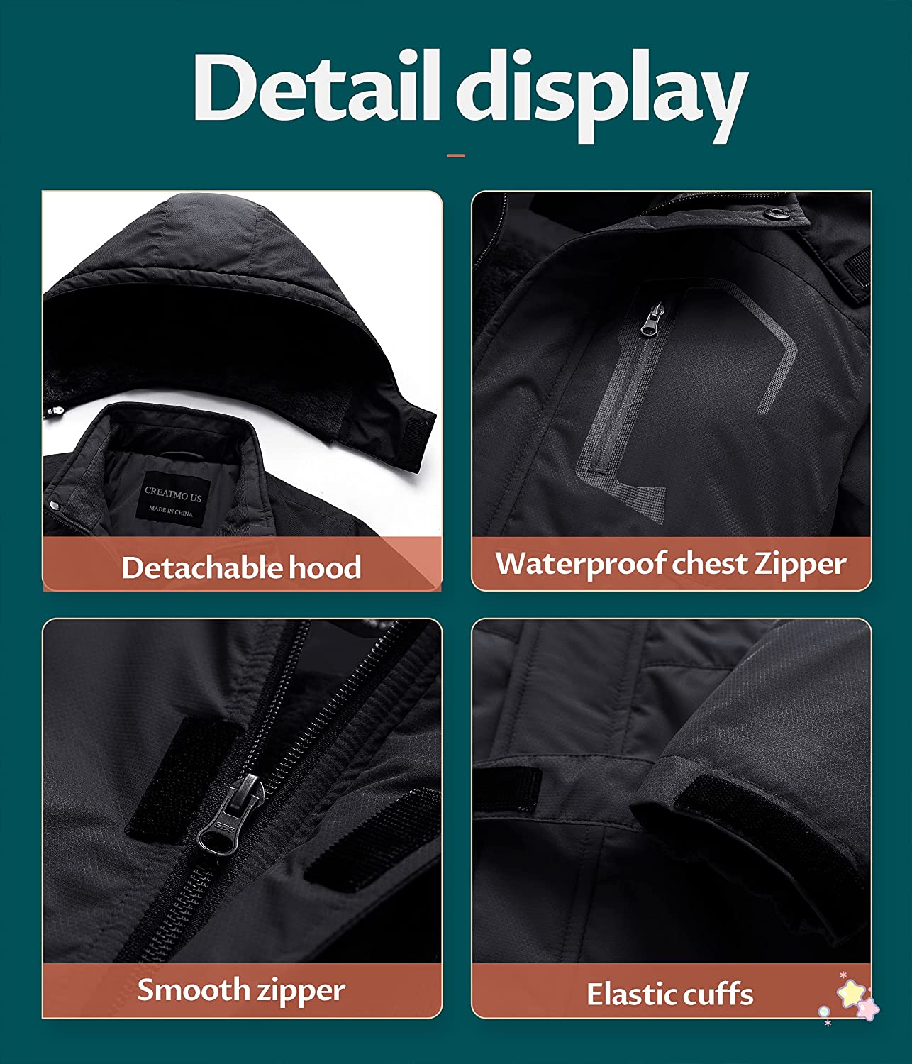 ❄ Windproof--Boy's snowboarding jacket with elastic drawcord detachable hooded and hem help seal in warmth. Adjustable hook-and-loop closure cuffs provide custom fit with your children gloves. High-quality SBS zipper is matched with windproof placket, perfectly locks the warmth.