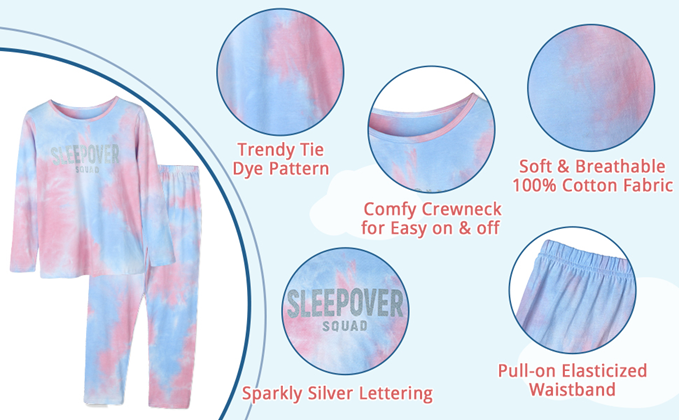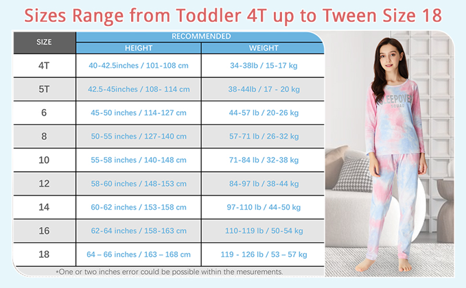 With impressively stylish design, these would be the must – have pajamas for girls’ wardrobe.Brand: TebbisFabric: 100% CottonGarment Care:*Machine Wash, water temperature should not exceed 30°C or 85°F*Line dry recommended, tumble dry available (with low heat)*Do not bleach*Iron at medium temperature,steam temperature should not exceed 150°C or 300°FSize Recommendation:Size 6: Recommended Height: 45 – 50 in (114-127 cm) / Recommended Weight: 44 - 57 lb (20 – 26 kg)Size 8: Recommended Height: 50 – 55 in (127-140cm) / Recommended Weight: 57 - 71 lb (26 - 32 kg)Size 10: Recommended Height: 55 – 58 in (140-148cm) / Recommended Weight: 71 - 84 lb (32 – 38 kg)Size 12: Recommended Height: 58 – 60 in (148 - 153cm) / Recommended Weight: 84 - 97 lb (38 – 44 kg)Size 14: Recommended Height: 60 – 62 in (153 - 158cm) / Recommended Weight: 97 - 110 lb (44 – 50 kg)Size 16: Recommended Height: 62 – 64 in (158 – 163 cm) / Recommended Weight: 110 - 119 lb (50 – 54 kg)Size 18: Recommended Height: 64 – 66 in (163 – 168 cm) / Recommended Weight: 119 - 126 lb (53 – 57 kg)Please choose your size referring to our size recommendation on the left picture.Package Content: 2 pieces girl pajama set