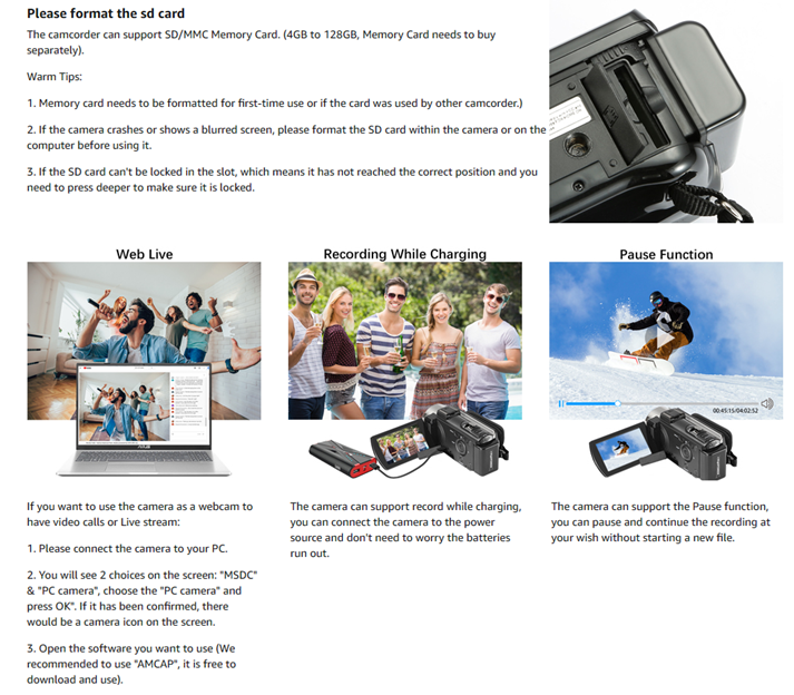 • 【Small and Compact Camcorder】: The camcorder supports SD/SDHC card up to 128GB (not included), just remember to format the SD card before use the camcorder first time. The camcorder support the tripod(not included) connection and the hole is standard size.