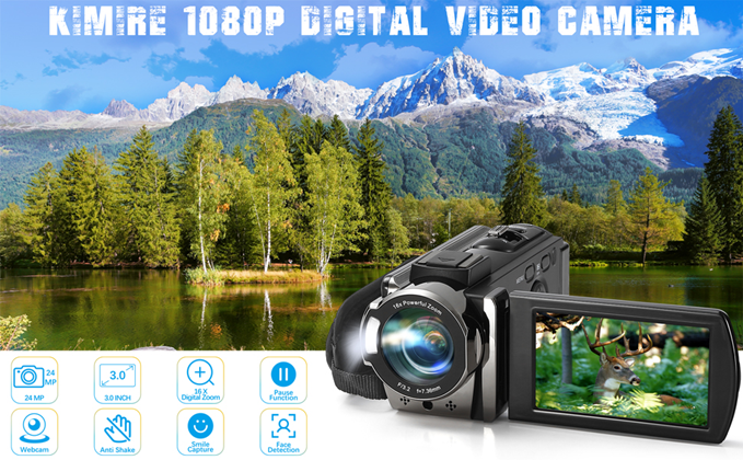 kimire Video Camera Camcorder Digital Camera Recorder Full HD 1080P 15FPS 24MP 3.0 Inch 270 Degree Rotation LCD 16X Digital Zoom Camcorder Camera with 2 Batteries(Black)