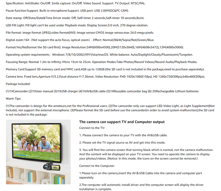 • 【Multifunction Camcorder】: 1080P(15fps) Video Resolution, 24M(6000x4500) Image Resolution, image format (JPEG), video format(AVI), 16X digital zoom, camcorder with fill light, 3.0 inch LCD and supports 270°rotation, Anti-shake, Face Capture, Beauty Function, Self-timer and Webcam function, Pause function, USB 2.0, TV Output, Setting Date and Time.