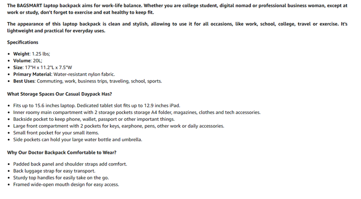 • LONG-LASTING MATERIAL- Dimensions: 11.2"L x 7.5"W x 17"H/ weight: 1.25lb. Made of durable, water-resistant nylon fabric with gold-plated zippers. Steel frame of the main compartment keeps the shape and structure of laptop backpack. Bagsmart doctor back packs use high quality material and it’s durable of usage.