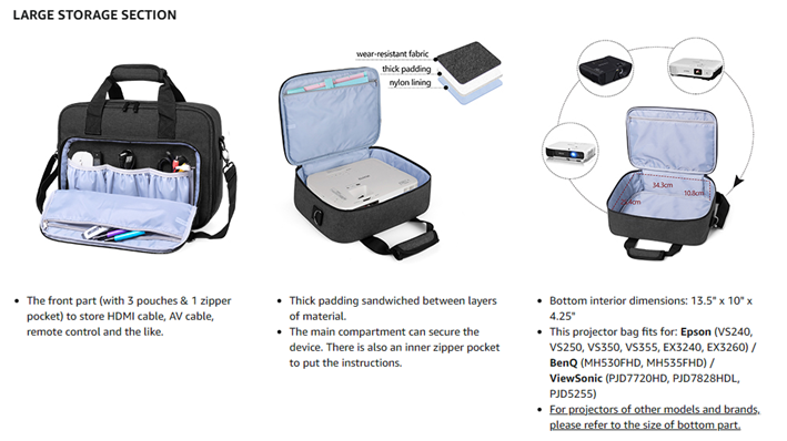 LARGE STORAGE SECTION: The main compartment can secure the device. There is also an inner zipper pocket to put the instructions. This projector bag fits for Epson (VS240, VS250, VS350, VS355, EX3240, EX3260), BenQ (MH530FHD, MH535FHD), ViewSonic (PJD7720HD, PJD7828HDL, PJD5255). For projectors of other models and brands, please refer to the size of bottom part.