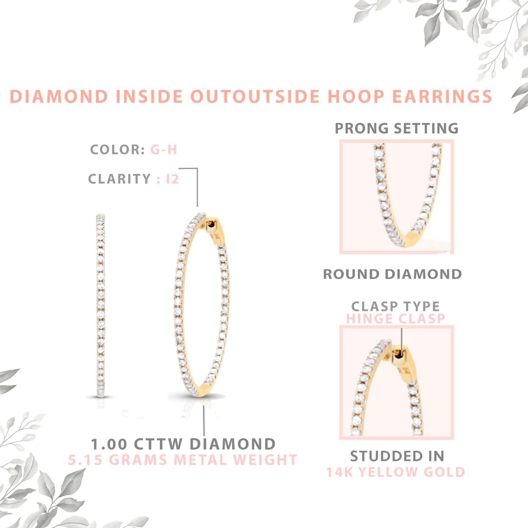 ⚡FINEST QUALITY MATERIALS: Fashioned with 1.00 carat Diamonds (Color: G-H, Clarity: I2) and hypoallergenic, nickel free 14K Yellow Gold. Metal weight of this pair of hoops is Approximate 5.15 grams. With high quality, sturdy craftsmanship, these earrings are made to be worn all day, everyday.
