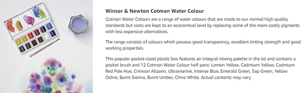 - Cotman Water Colors possess good transparency, excellent tinting strength and good working properties