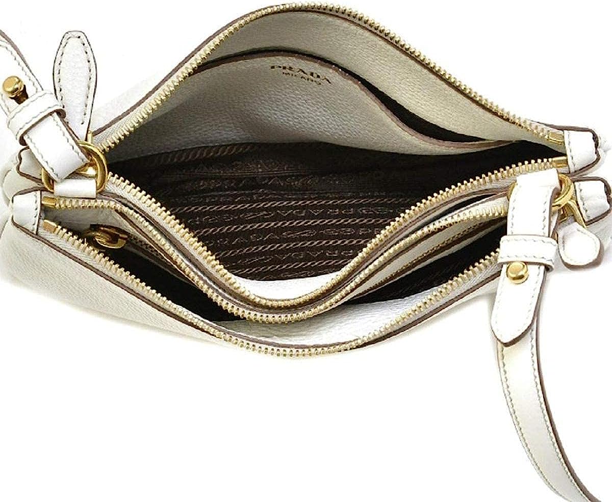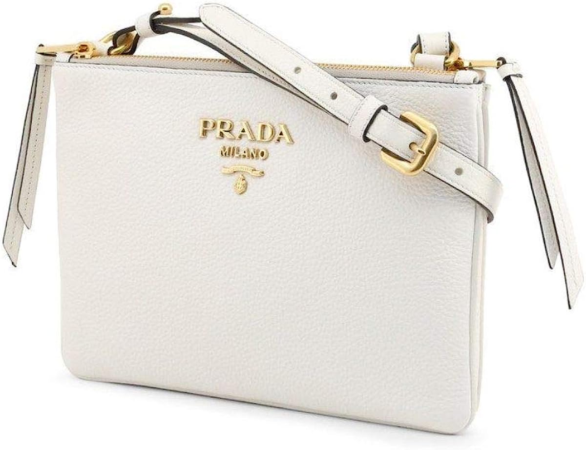 This Prada Women's White Vitello Phenix Leather Crossbody Handbag is a beautiful and elegant handbag that can be worn with everyday looks. It is practical yet luxurious and comes with an adjustable shoulder strap. The two exterior pockets are great for storage and organizing your personal belongings. The gold toned hardware and Prada Paris logo goes beautifully with this white Prada handbag.