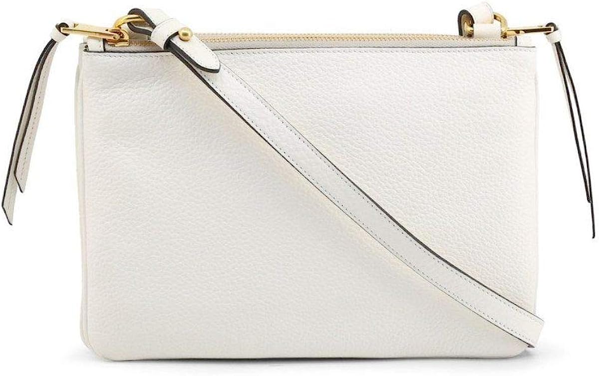 White. Leather. Gold Hardware. Removable/Adjustable Shoulder Strap drop 21-23". Double Zip Closure. Two Exterior Pockets.