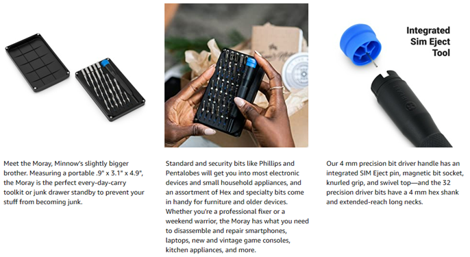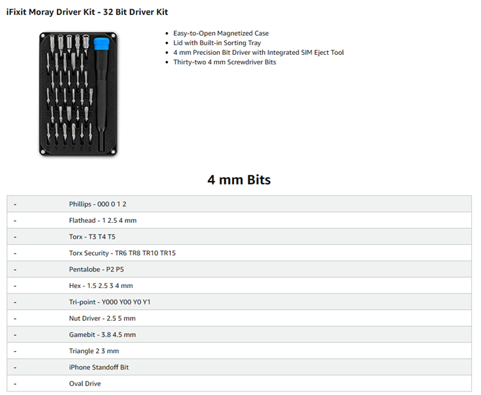 | Drive System | Phillips, Flathead, Torx, Torx Security, Pentalobe, Hex, Tri-point, Nut Driver, Gamebit, Triangle, iPhone Standoff bit, Oval Drive |