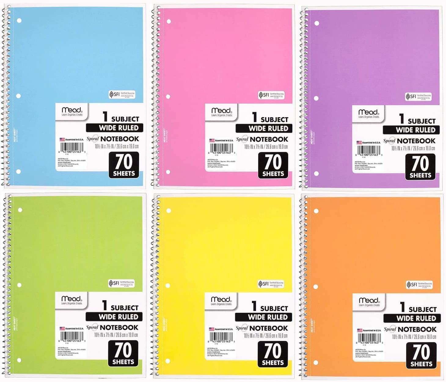 Mead Wide Ruled Spiral Notebooks, Bulk Pack of 12 Colors - 1-Subject Spiral Notebooks Wide Ruled - 70 Pages - Cute Single Subject Notebook Wide Ruled for Adult & Kids - School & Office Use.