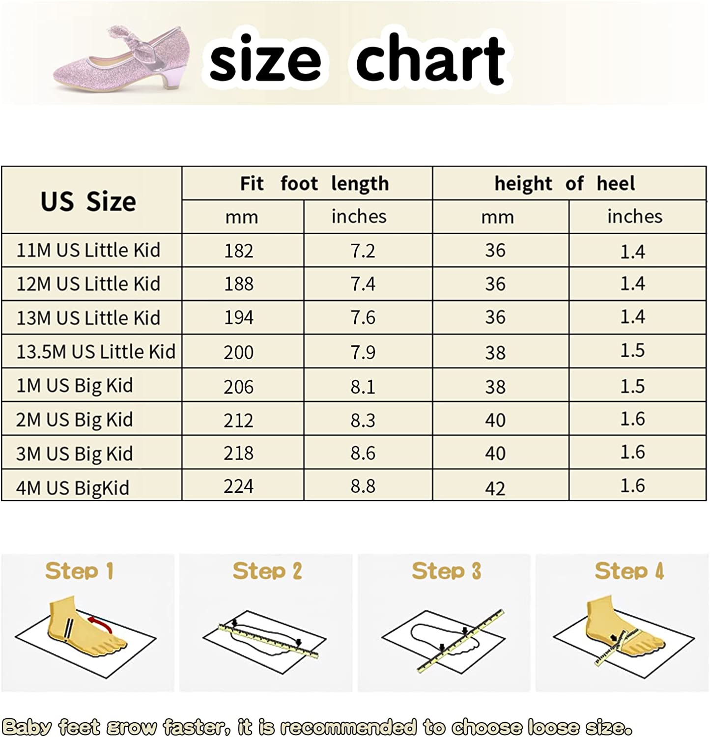 - ?SIZE TIPS: This is glitter purple, 13.5M Little Kid. Our purple high heels for little girls princess shoes are an American standard size chart. For this child high heels shoes for girls, we recommend to choose one bigger size to keep the a growing room,so they can be big girls dress shoes.