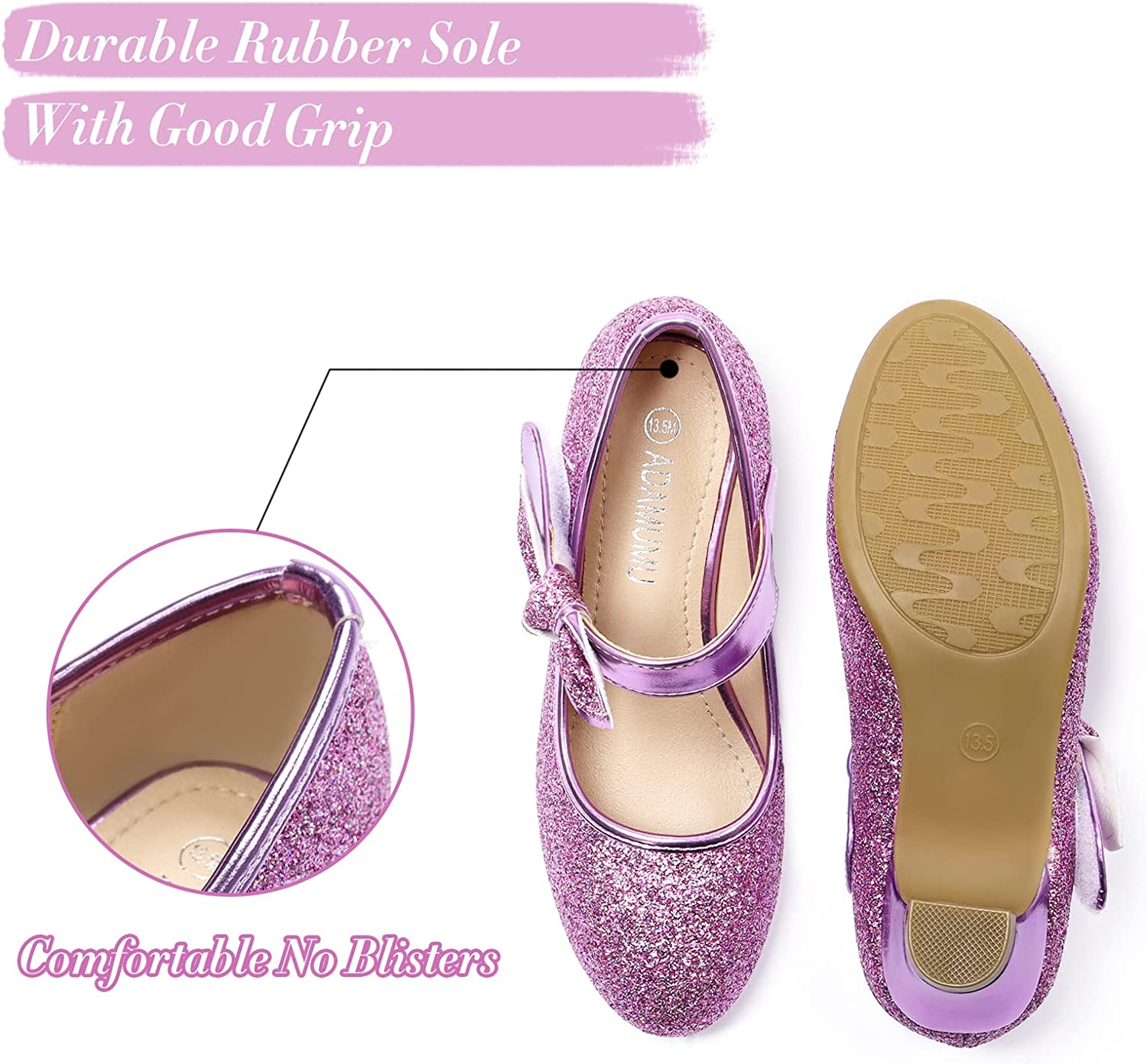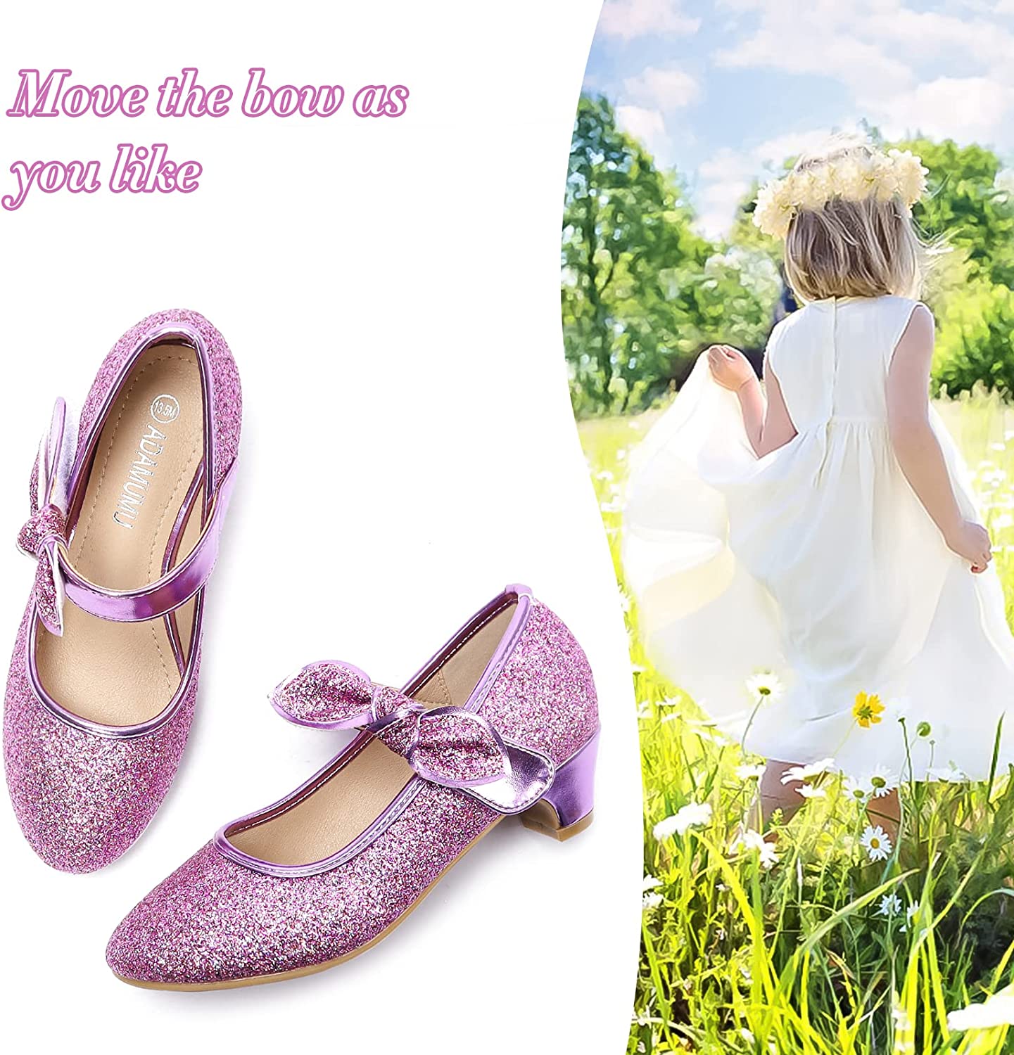 ADMUMU is a store dedicated to providing fashionable and colorful children's shoes for children.Elegant purple classic Mary Jane heels for girls, the adjustable hand-made glitter bow is so cute, your girls can move it as she likes.Round toe design for no more pinching, memory foam insole with arch support and soft breathable lining, so our girls dress shoes offer a comfortable feet experience for little kids. The main part of girls low heel shoes use soft leather, so no blisters on toddlers' feet.These girl formal shoes are nice choices as great gifts for princess girls.These sparkle shoes for girls are suitable for different occasion, like performance, party, formal, church, casual and dress up. Also for flower girls shoes and wedding shoes for kids.