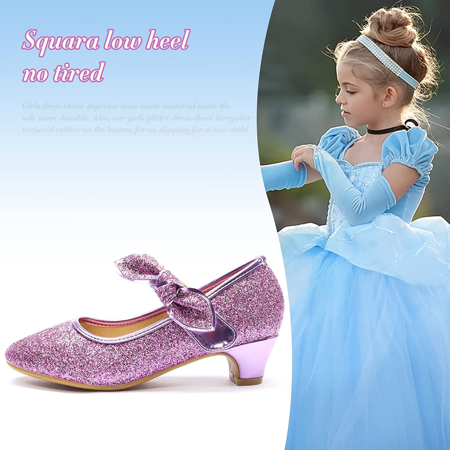- ?UPPER MATERIAL: The cute high heels for girl dress up shoes use high-quality breathable leather anti-slip soft rubber and purple glitter heels for girls enjoy a comfortable and beautiful walking experience. The sparkly heels for girls has been reinforced, will not easy to fell off.