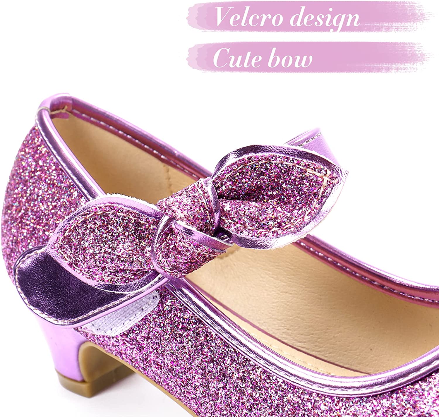 - ?COMFORTABLE: The purple glitter shoes for girls are 1.4-inch/3cm. It is started height for girls small heel dress shoes. We use artificial leather insole with a thick memory foam on purple sparkle shoes for girls, keep toddlers feet dry and relaxed.