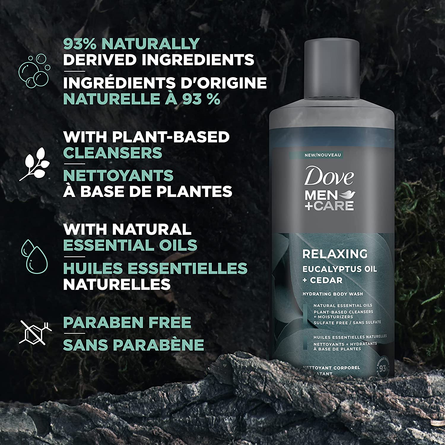 Dove Men + Care Eucalyptus Oil + Cedar Body Wash for men hydrates skin while offering you a relaxing and refreshing shower experience. Made with natural essential oils and plant-based cleansers, this body wash washes away tough germs and moisturizes your skin. This essential shower gel delivers clean and comfortable skin in just one shower. This body wash does what it promises: it's tough on odor, but not on your skin. Hit the reset button for your body and mind from the moment you apply it and take in the natural scents of Eucalyptus and Cedar. Sulfate-free and cruelty-free, this natural inspired body wash not only provides care for your skin, but also for the planet. Following Dove's global commitment to more sustainable packaging, we've designed every bottle to be recyclable and made with 100% recyclable plastic. And we're proud of what we've made. If you're looking for further proof, complete your grooming routine with the entire Dove Men + Care naturals range. Pair this body wash with the Dove Men + Care Eucalyptus + Birch Anti-Perspirant Spray or the Dove Men + Care Dry Spray Eucalyptus+ Birch. Or try our Dove Men + Care Body Wash, available in purifying scents like Charcoal + Clove and invigorating scents like Lime + Avocado Oil.