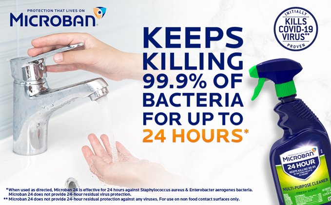 Microban 24 Hour Multi-Purpose Cleaning Spray keeps killing 99.9% of bacteria** for up to 24 Hours, even after multiple touches*, to support a clean and healthy home. This all-purpose sanitizing cleaner is great for every day messes and is suitable for use on all different types of non-food contact hard surfaces, like garbage cans, bathroom sinks, cabinets, etc. Use this multi-purpose spray for an efficient clean. Use around the home and on other high touch areas. This powerful formula penetrates soap scum and greasy soils while reducing odors. Let Microban protect you and your family from harmful germs for a healthy home. *When used as directed **Effective against S. aureus & E. Aerogenes +Effective against bacteria and viruses (Human Coronavirus, Influenza A H1N1, (RSV) Respiratory Syncytial Virus) ++ Effective against Aspergillus niger