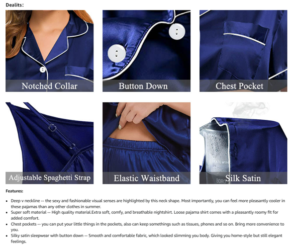 • 【Pajama Features】--- ❤Cami top: The cami features with an adjustable spaghetti strap so you can easily adjust its length. Sexy V-neck, inspires sultry flirt and your sexy.❤Satin sleepshirt: Loose-fitting and buttoned with brand characteristics sleepshirt features short sleeve, a chest pocket and notched collar with contrast piping along collar, front placket, sleeve and pant hem. ❤Pants and Shorts: Designed with elastic waistband to make you wear more comfortable and close-fitting.