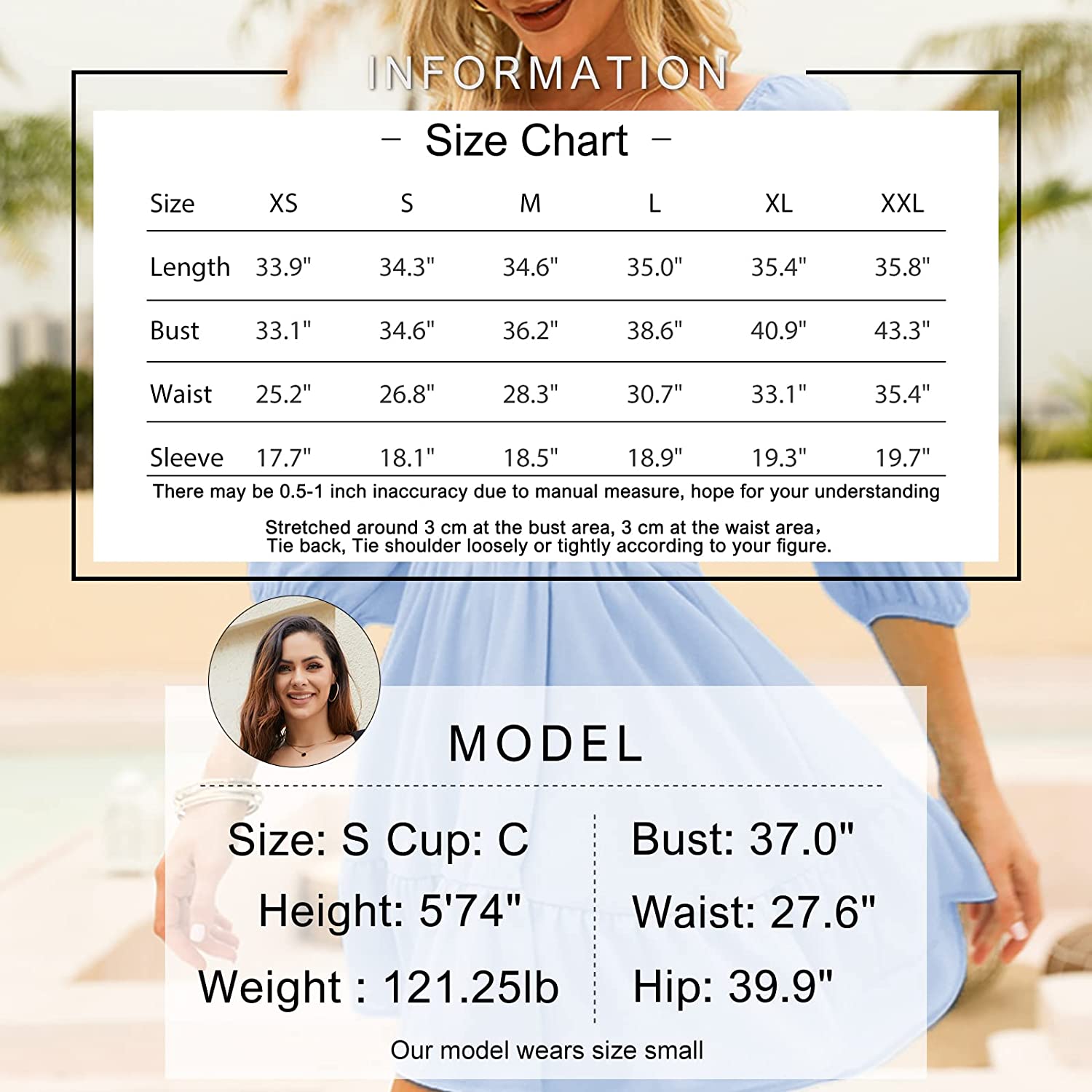 Feature: tie back, open back, square collar, ruched bust, smocked waist, elastic high waist, lantern sleeve, 1/2 sleeve, off shoulder, elastic cuff, above knee length, A line, slim fit, swing and elegant vintage style.